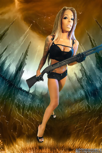 Busty scifi Action Girls model Santanta in black bra and hotpants with gun and shotgun