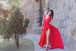 Italian camgirl Ross Charleen outdoors posing in beautiful red dress flashing her panties in public