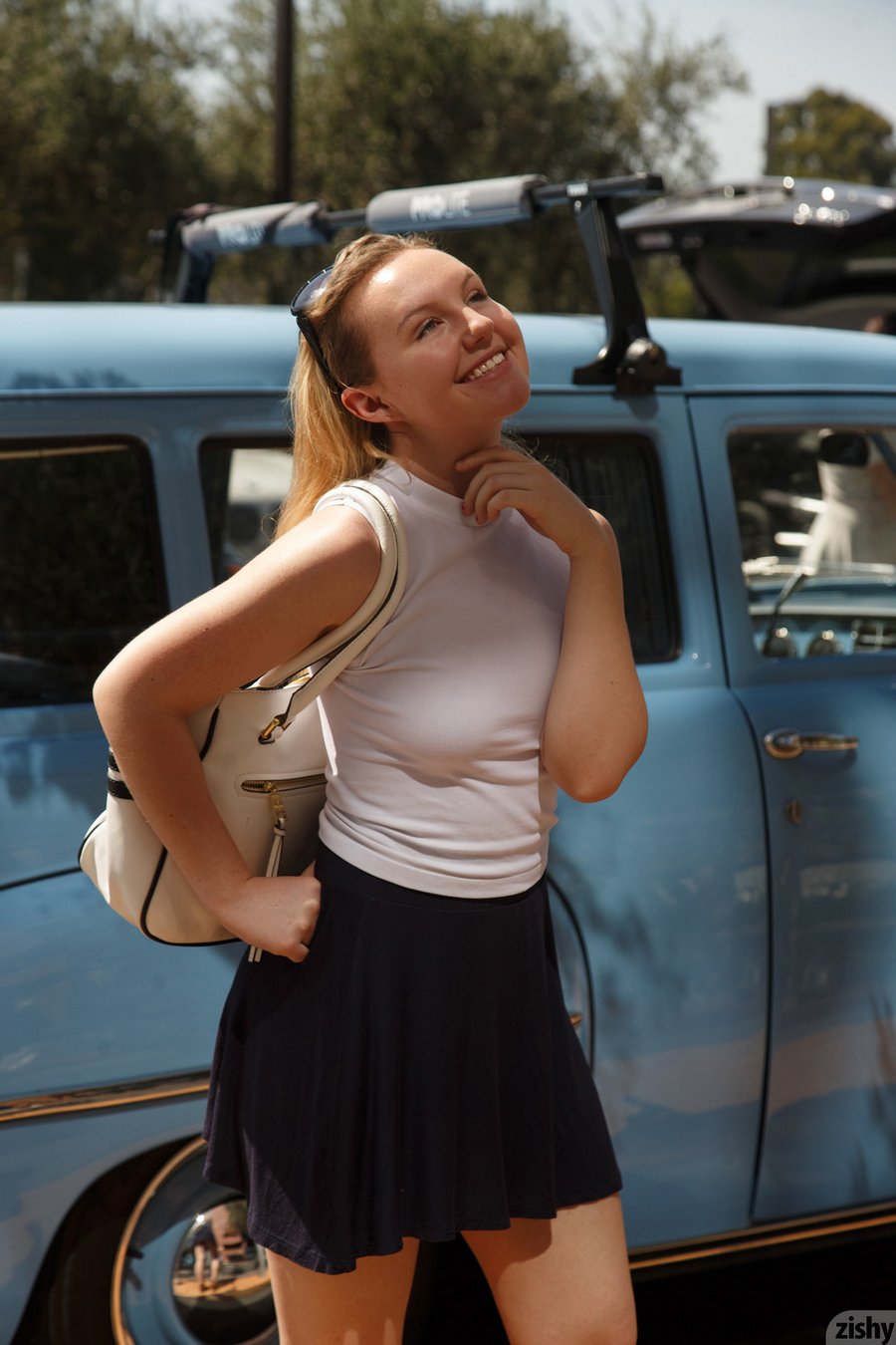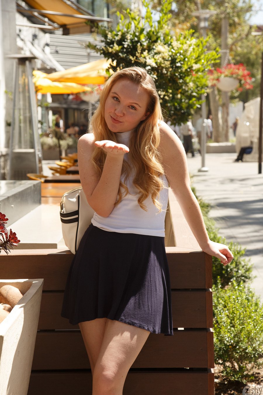 Blonde Zishy model Oakley Jacobs gives upskirts and flashes nude breasts in public in Ripped Knickers Gotta Go
